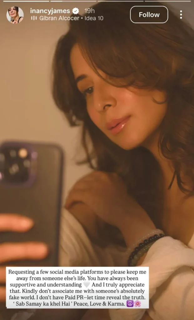 “Kindly don’t associate me with someone’s absolutely fake world. I don’t have paid PR let time reveal the truth. Sab samay ka khel hai,” she wrote, adding the words “Peace, Love & Karma.”